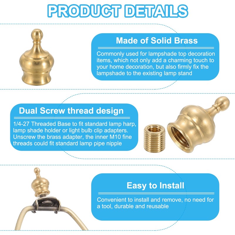 - Color:Brass Tone;Material : Brass;Lamp Final Size:15 x 23mm/0.59 x 0.91 inch(D*H);Lamp Finial Female Thread Size:M10*1mm; Brass Adapter Thread Size:M10 Male to 1/4-27 Female;Package List:3 Set x Lamp Finial Kit