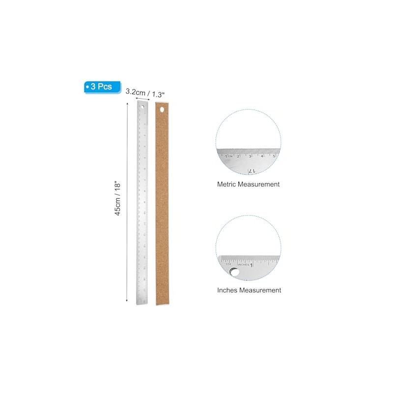 - Specification Color: Silver, Wood Material: Stainless Steel, Cork Size: 18x1.3x0.08 inch / 45x3.2x0.2 cm (L*W*T) Packing List: Stainless Steel Ruler x 3