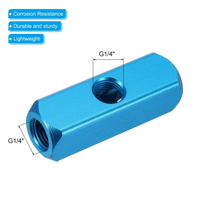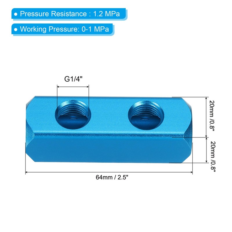 - Color: Blue; Thread Size: G1/4 Inch; Working Pressure: 0-1 MPa; Pressure Resistance : 1.2 MPa; Working Temperature: -4 - 140℉; Size: 64 x 20 x 20 mm / 2.5 x 0.8 x 0.8 inch (L*W*H); Packing List: 3 x Air Manifold