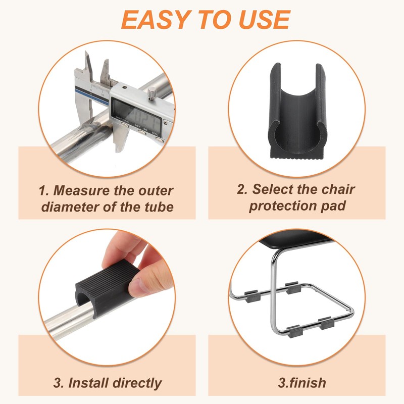 The rubber protectors are very simple and easy to install, no tools or cleaning of the chair legs are required, just slide the foot pads onto the bottom of the legs and use them: 1. Measure the outer diameter of the chair; 2. Choose the appropriate U Shaped Chair Leg Caps.