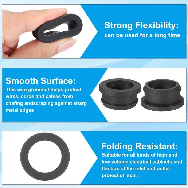 - Advantage: Rubber grommets are made of silicone rubber, flexible, durable, foldable, strong insulation protection. Designed to protect wires from wear and tear when passing through holes, they can be used for a long time to solve long-term wire protection problems and can be used to manage and route cables in a neat and tidy way