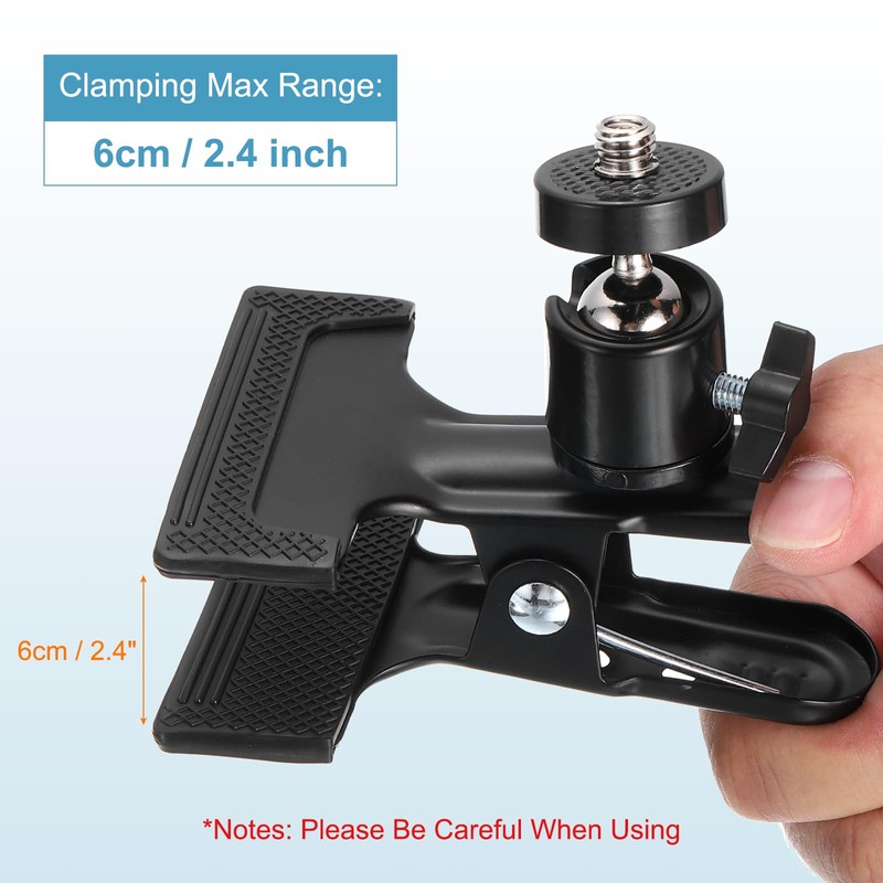 - Specification: Material: Metal; Color: Black; Tripod Head Female Size: 3/8"-16UNC; Clamp Size: 11 x 8 x 7cm / 4.3 x 3.1 x 2.8 inch (L*W*H); Clamping Max Range: 6cm / 2.4 inch; Package Content: 2 x Tripod Camera Clip Clamp