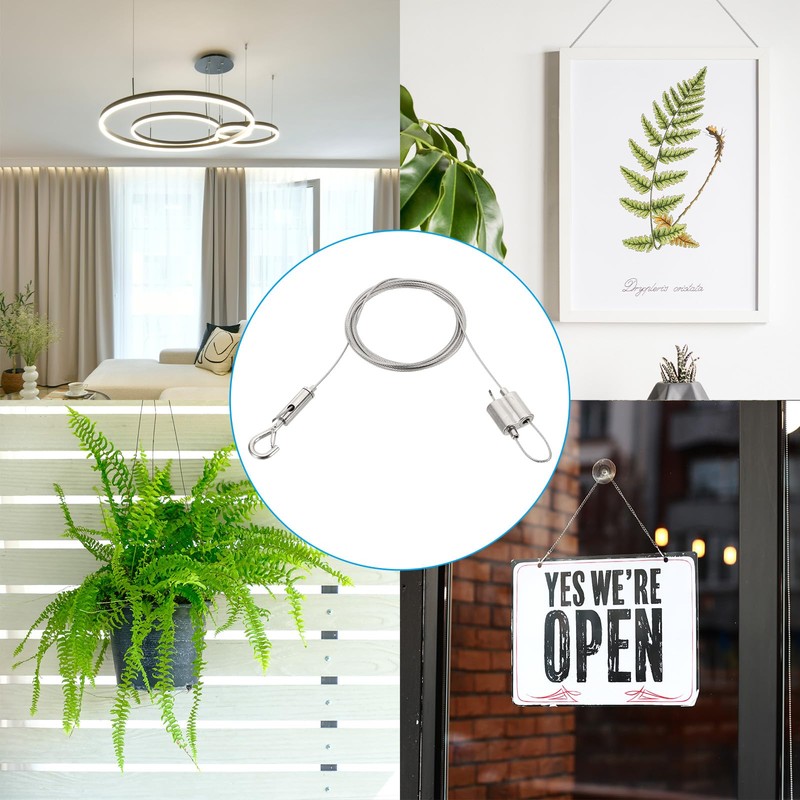 - This adjustable picture hanging wire kit is extensively used for hanging pictures in galleries, displaying exhibits in shopping malls, suspending billboards, ceiling lights, flower pot pendants, curtains, plant stands, LED screens, and shade sails.