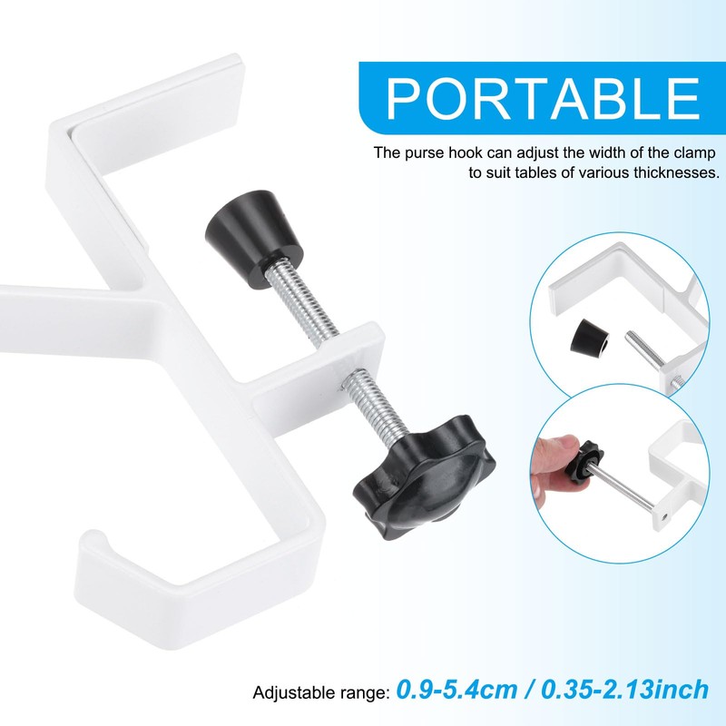 - Application: Thanks to their unique design, portable desktop purse hangers can be used on tables of various materials and sizes. When you go to classrooms, restaurants, libraries and bars, these hooks can hang your handbags on the table to keep them clean and remind you not to lose them. In addition to purses, they can also be used to hang headphones, backpacks, hats, bags, etc.