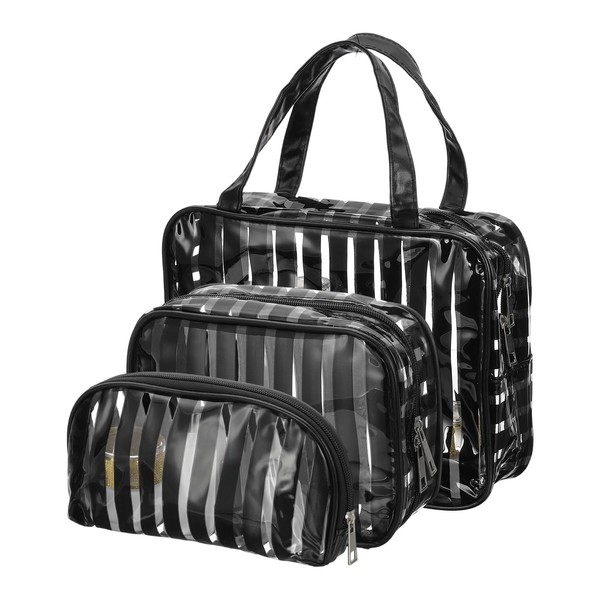 PATIKIL 3 Pcs Clear Makeup Cosmetic Bag, Transparent PVC Travel Toiletry Bag Waterproof Vinyl Organizer Makeup Pouch with Zipper and Handle Strap for Women Men Airport Airline, Black