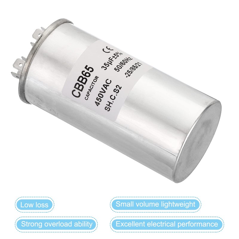 - Specification:Model: CBB65;Material: Metallized Polypropylene, Aluminum Case;Lead End: 2 Terminal (8 pins);Rated Capacity: 35uF;Tolerance: ±5%;Rated Voltage: 450V AC;Rated Frequency: 50/60Hz;Climatic Category: -25/85/21;Overall Size: 50 x 100mm/1.95 x 3.9inch (D x H); Package Includes: 1 x CBB65 Capacitor