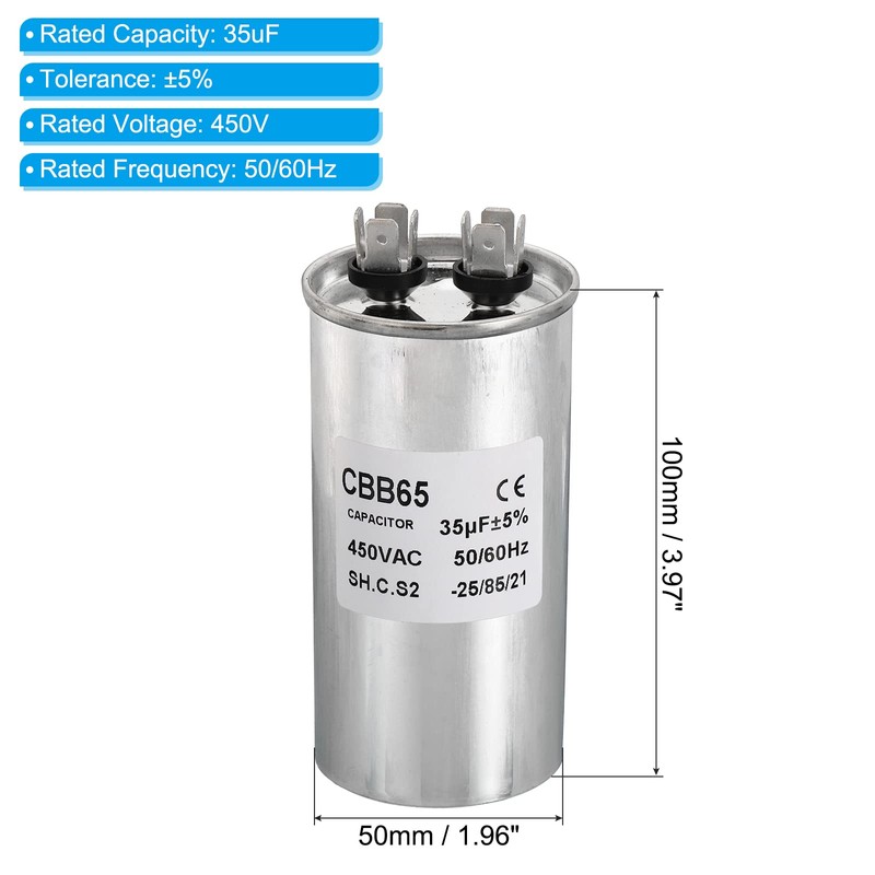 - Specification:Model: CBB65;Material: Metallized Polypropylene, Aluminum Case;Lead End: 2 Terminal (8 pins);Rated Capacity: 35uF;Tolerance: ±5%;Rated Voltage: 450V AC;Rated Frequency: 50/60Hz;Climatic Category: -25/85/21;Overall Size: 50 x 100mm/1.95 x 3.9inch (D x H); Package Includes: 1 x CBB65 Capacitor