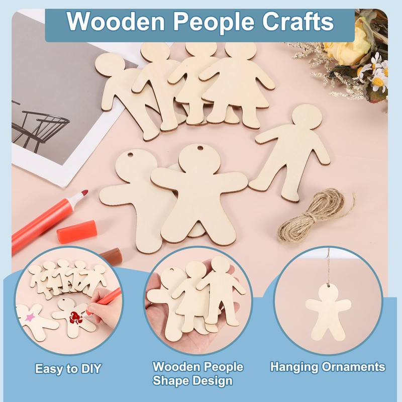 PATIKIL 4" Height Natural Wooden People Cutouts, 50Pcs Blank Female Male Shapes Unfinished Wood Hanging Ornaments & 6.6FT Jute Twine for DIY Crafts