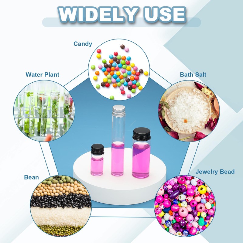 - The test tube is not only suitable for storing jewelry beads, lash wands, candy, chocolate, beans, granules, spices, dried flowers, bath salt, powders, and liquids, but also great for DIY crafts, scientific experiments, plant propagation, holiday decorations, soil sorting, etc. Great for water quality checks in various occasions, such as aquariums, rivers, etc.