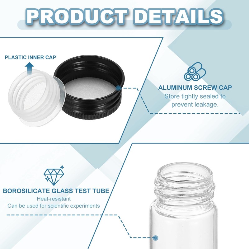 - The test tube is made of borosilicate glass, which is heat-resistant and can be used for physical and scientific experiments. It can be reused after washing. The plastic cap fits tightly to the bottle mouth, keeping it sealed to prevent the stored items from drying out, and the liquid will not leak. The test tube adopts a transparent design, which is convenient for observing the changes of plants or liquids. The flat bottom design allows for stable placement without a shelf.