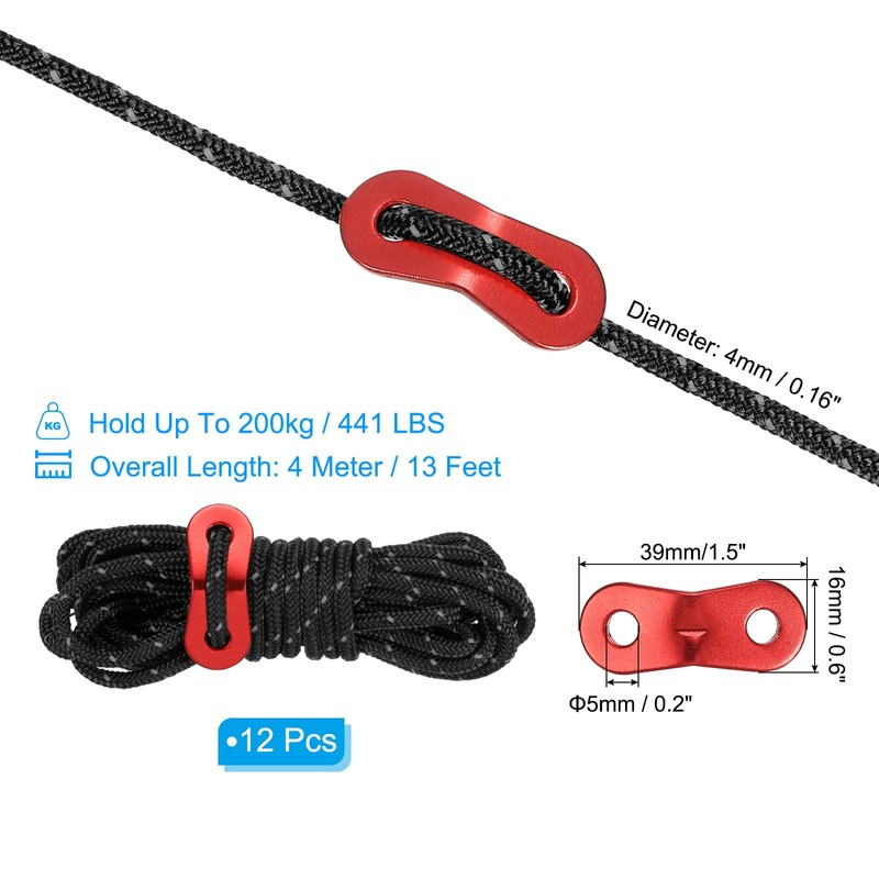 - Rope Diameter: 4mm / 0.16 inch; Overall Length: 4 Meter / 13 Feet; Packing List: 1 Set - 12 x Tent Ropes & 12 x Aluminum Cord Adjusters