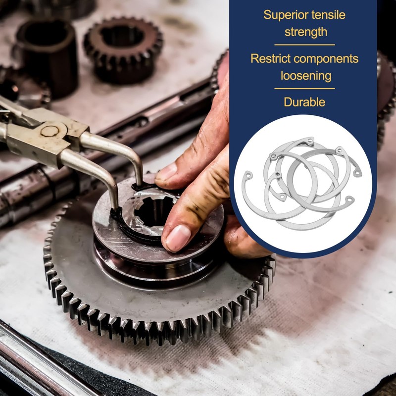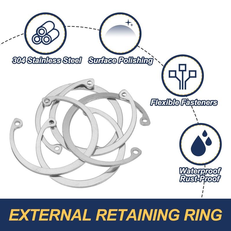 - Advantage: The retaining rings are made of sturdy 304 stainless steel, surface polishing, offering superior tensile strength and durability, and they are waterproof and rust-proof. Snap rings, classified as semi-flexible retaining fasteners, can rebound when subjected to tension
