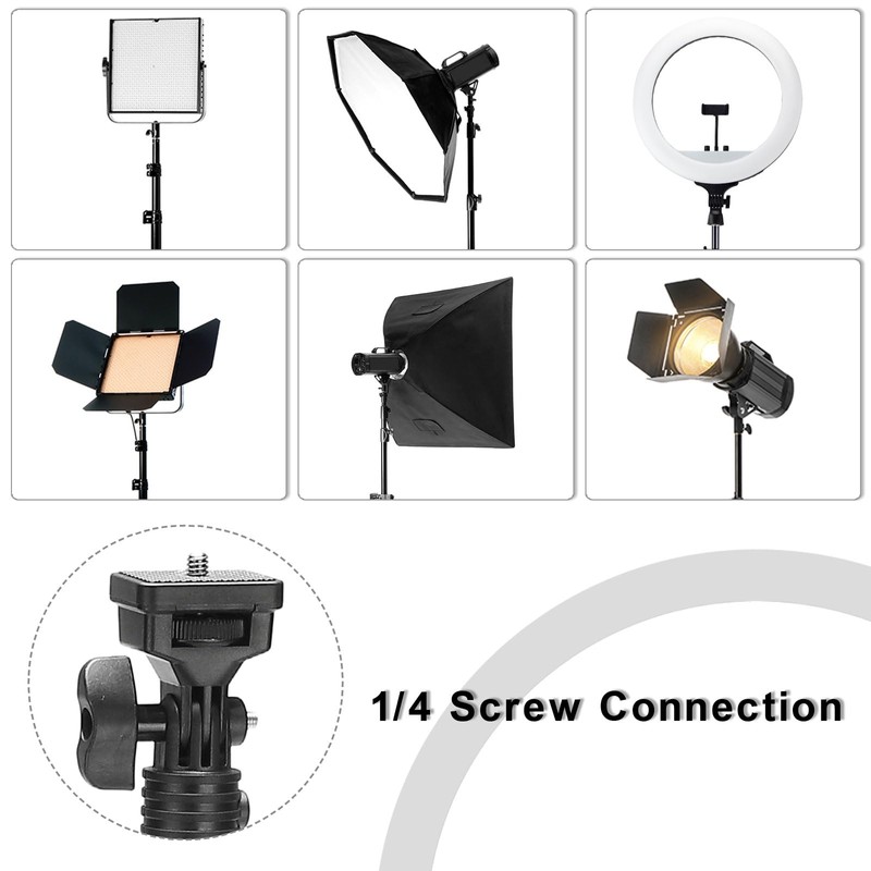 - The top of the stand is equipped with a standard 1/4 inch screw, suitable for reflectors, ring lights, LED light panels, standard lights, soft boxes, strobe, flashes, backdrops, umbrellas, panel lights, action cameras, smartphones, phone. Can also be used as a floor stand for mobile photography, streaming. Suitable for studio and outdoor photography.