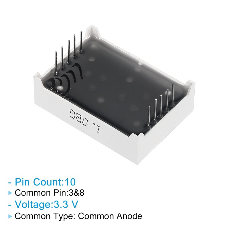 - Light Color: Yellow Green; Model: 1.0BG; Package Type: Plug-In; Common Pin: 1&6; Voltage: 3.3V; Number of Pins: 10; Number of Characters: 1 bit; Common Type: Common Anode; Character Height: 25 mm; Size: 24 x 34 x 10.5 mm(L*W*H)