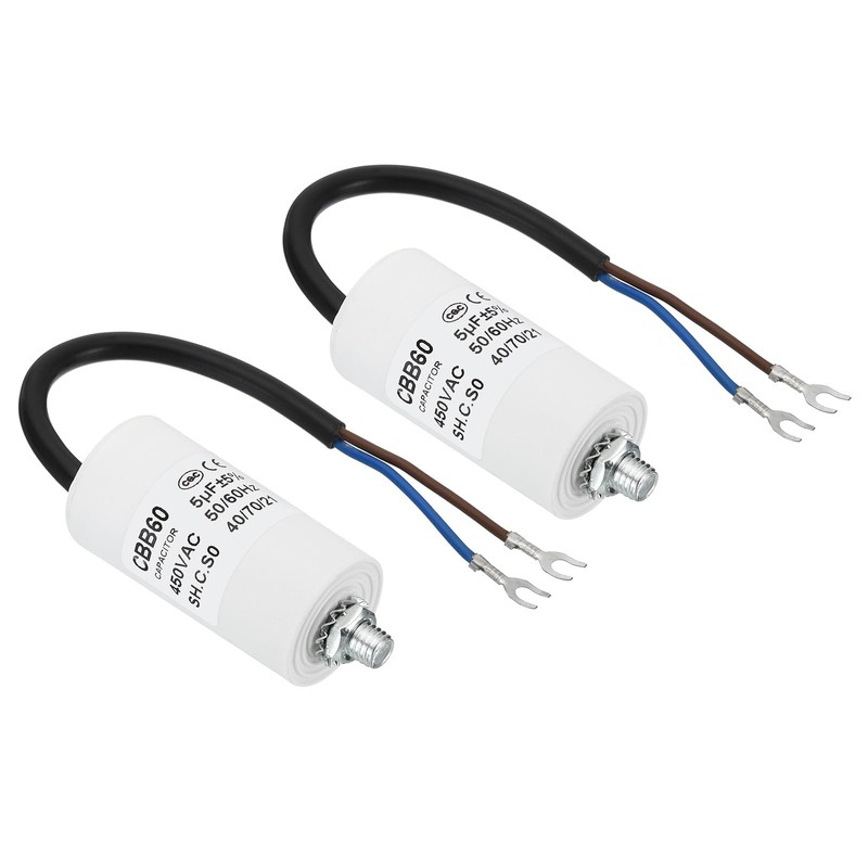 - Model: CBB60; Material: Polypropylene Film Plastic Shell; Lead End: U Terminal Wires; Tolerance: ±5%; Rated Capacity: 5uf; Wire Length:165mm/6.435inch(+/-20mm) ; Climatic Category: 40/70/21; Body Size(+/- 3mm): 30 x 57mm/1.17 x 2.22inch(D x H);Screw Size:M8x1.25x12mm ; Pack of 2Pcs Run Capacitor