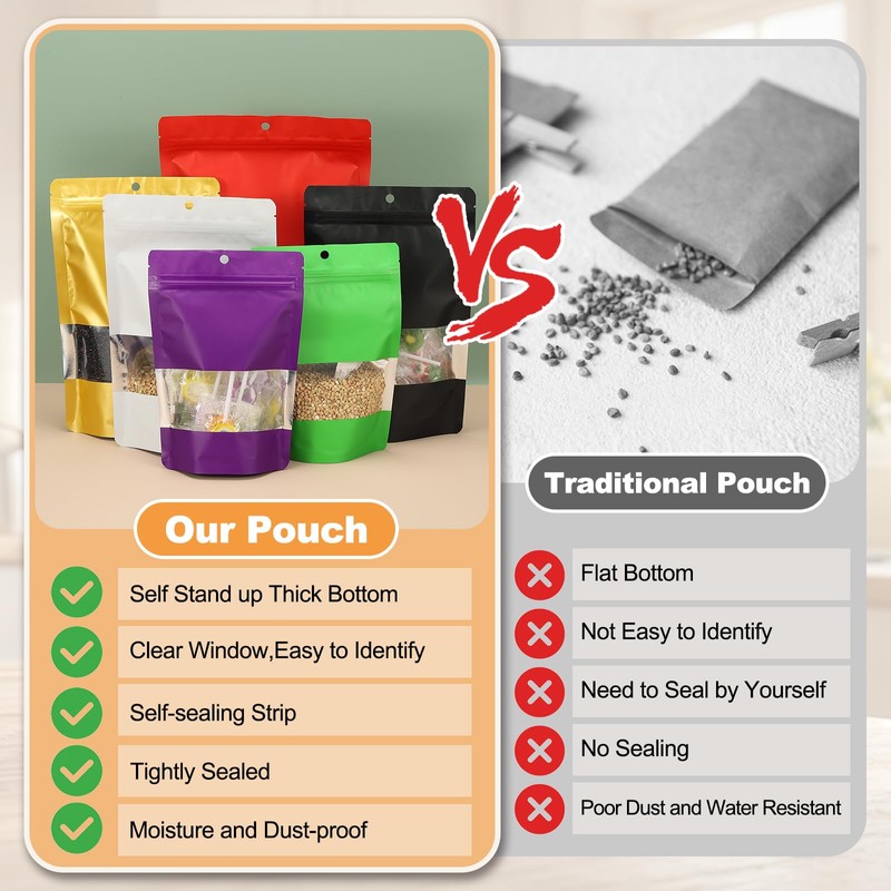 Convenient Design: The glossy front window design can display items inside. Self-stand thickened bottom is enhances the bag's weighing capacity. The U-shaped notch is designed for easy opening.
