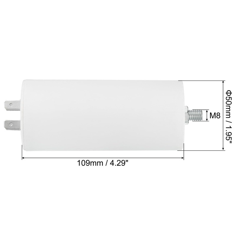 - Model: CBB60; Material: Polypropylene Film Plastic Shell; Lead End: 4 pins; Tolerance: ±5%; Rated Capacity: 70uf ; Climatic Category: 40/70/21; Body Size: 50 x 109mm/1.95 x 4.25inch(D x H);Screw Size:M8x1.25x14mm ; Pack of 1Pcs Run Capacitor