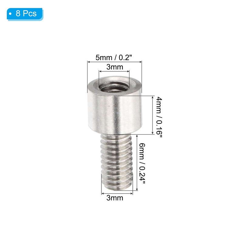 • Color: Silver Tone; Material: Stainless Steel; Thread: M3; Thread Length: 6mm / 0.24 inch; Post Length: 55mm / 2.17 inch; Overall Size: 61 x 5mm / 2.4 x 0.2 inch(H*D); Packing List: 8 x Male to Female Binding Screw