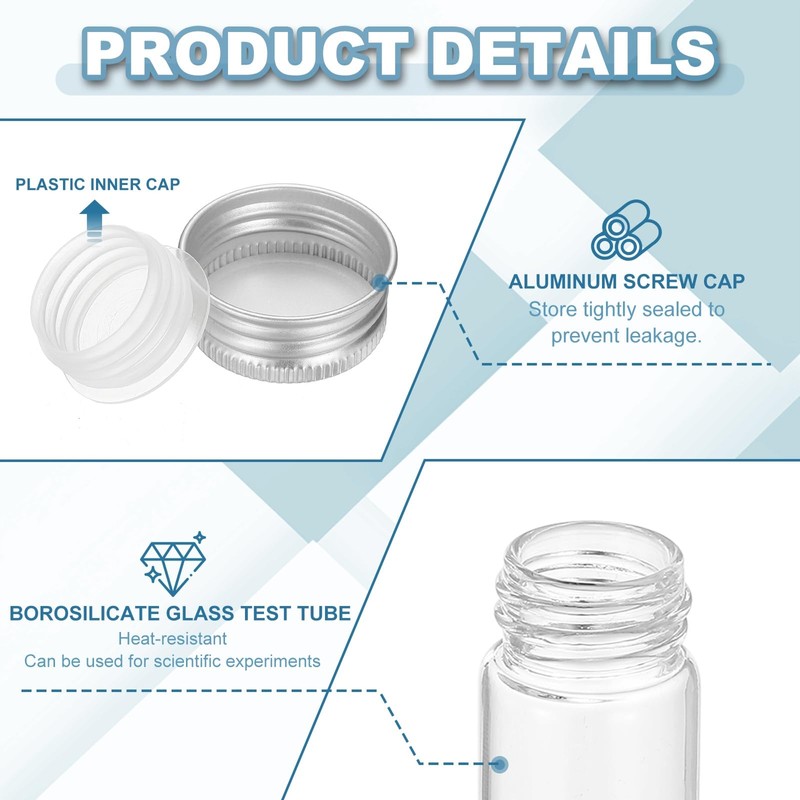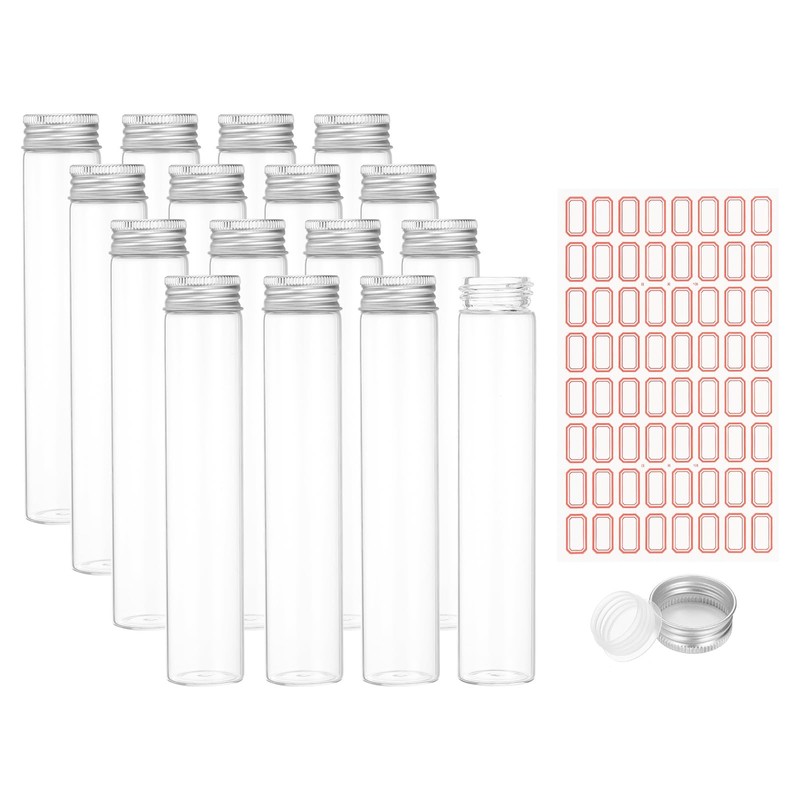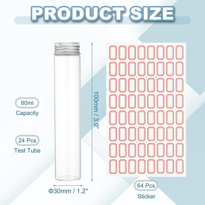 - Specification: Material: Borosilicate Glass (Bottle Body), Plastic (Inner Cap), Aluminum (Bottle Cap); Cap Color: Silver; Test Tube Color: Clear; Capacity: 80ml; Size: 30 x 150mm / 1.2 x 5.9 inch ( Outer Dia x L ); Packing List: 24 x Test Tube, 24 x Aluminum Bottle Cap, 24 x Plastic Inner Cap; 64 x Sticker