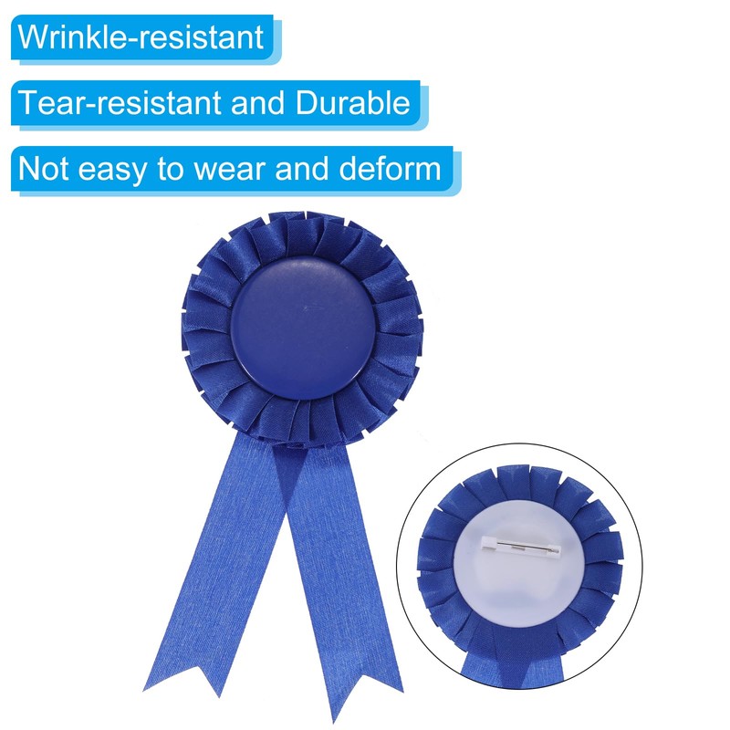 - Advantage: 1. The rosette ribbon is made of polyester, which is wrinkle-resistant, not easy to wear and deform, tear-resistant, and durable. 2. The middle of the award ribbon is blank, you can use your imagination to DIY freely. Such as you can draw. 3. Widely used. The rosette ribbon can be used in many places. Such as competitions, graduations, weddings, parties, etc.