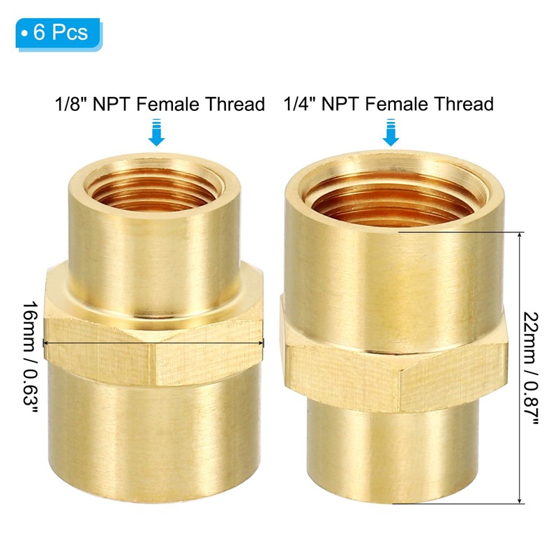 - Specification: Material: Brass; Work Temperature Range: -65 to 250 F Degree; Max Work Pressure: 1200PSI; Thread Size: 1/8" x 1/4" NPT Female Thread Total Size: 22 x 16mm/ 0.87 x 0.63inch (L x Hex Width) Package List: 3Pcs x Brass Pipe Fittings Coupler