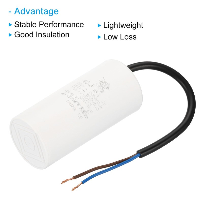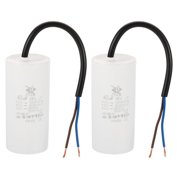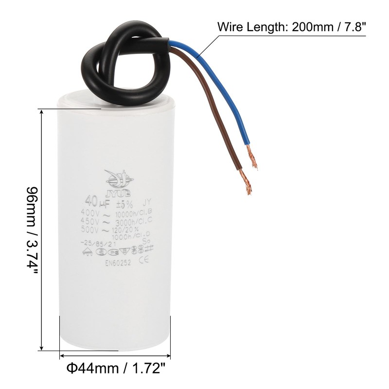 - Model: CBB60; Material: Polypropylene Film Plastic Shell; Lead End: 2 Wires; Tolerance: ±5%; Rated Capacity: 40uf; Climatic Category: 25/85/21; Body Size: 96 x 44mm/3.74 x 1.72inch(H x D);Shell Color: White; Wire Length: 200mm/7.8inch;; Pack of 2Pcs Run Capacitor