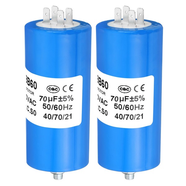 - Model: CBB60;Material: Polypropylene Film Plastic Shell;Lead End: 4 pins;Tolerance: ±5%;Rated Capacity: 70uf ;Climatic Category: 40/70/21; Body Size: 110 x 50mm/4.29 x 1.95inch (H x W) ; Pack of 2PcsRun Capacitor
