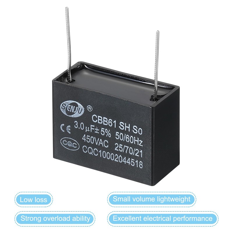 - Specification: Model: CBB61; Material: Polypropylene Film Plastic Shell; Terminal: 2pins; Tolerance: ±5%; Rated Capacity: 3uF; Climatic Category: 25/70/21; Body Size:38 x 18 x 28mm/1.48 x 0.7 x 1.09inch(L x W x H); Shell Color: Black; Rated Voltage: 450V AC; Rated Frequency:50/60Hz; Pack of 2Pcs CBB61 Capacitor