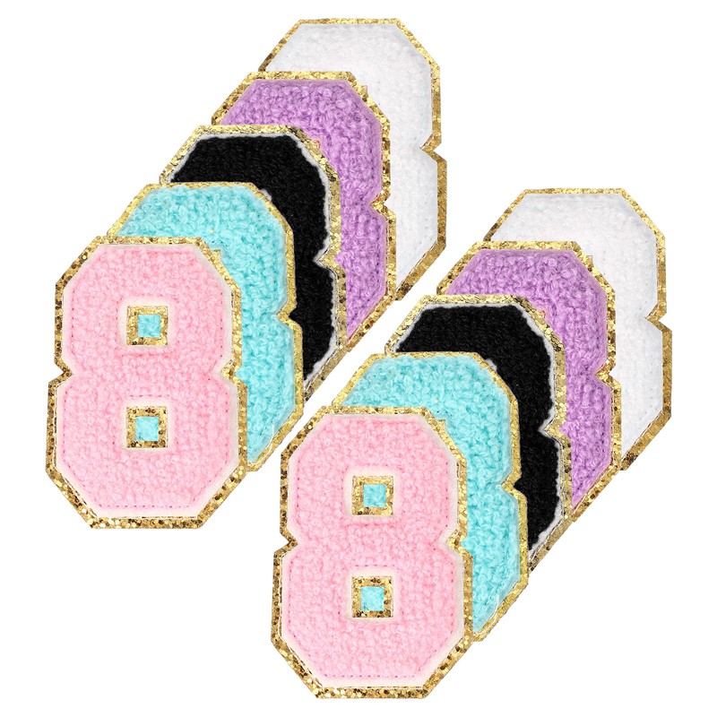 PATIKIL Chenille Number Patches, 10 Pieces Number Iron On Number Embroidered Patch Glitter Applique for Hat Jacket Clothing Bags DIY Decoration Backpack, Number 8