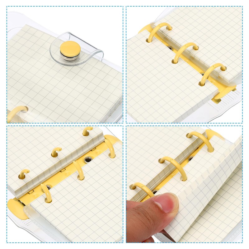 - Advantage: The soft PVC transparent exterior offers durability and a minimalist feel, adding a touch of elegance to your workspace. Comes equipped with ample paper for note-taking, organizing, and storing important documents. The 3-ring design provides secure placement for the included sheets of paper. The Snap button design is a protector, that prevents paper from falling.