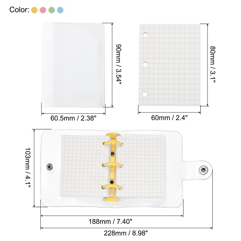 - Color: Pink, Yellow, Green, Blue; Material: PVC; Paper Size: 80 x 60mm / 3.1 x 2.4 inch(L*W); Cover Size: 103 x 85mm / 4.1 x 3.3 inch(L*W); Packing List: 4 x Round Ring Notebook Binders, 320 x Paper, 12 x Binder Inner Paper Pockets