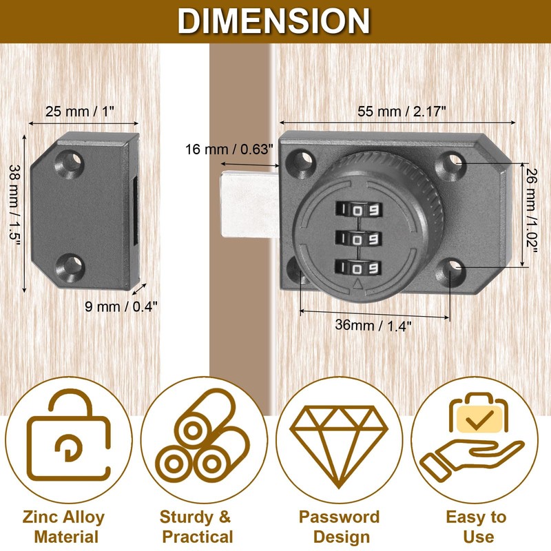 - ZINC ALLOY MATERIALS - Our cabinet password lock is made of solid zinc alloy, with a thickened base, high strength, not easy to wear and tear, and the surface is electroplated and polished to isolate oxidation, rust-proof and durable effectively.