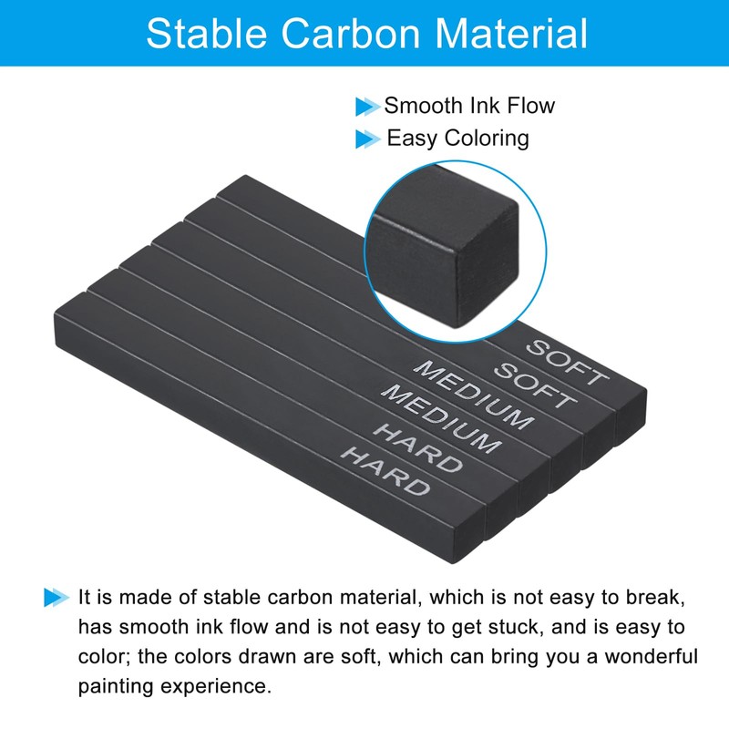 • Color: Black; Material: Carbon; Overall Size: 6.3x0.6x0.6cm / 2.48x0.24x0.24inch (L*W*H); Package List: 6 x Compressed Charcoal Sticks (Soft: 2pcs, Medium; 2pcs, Hard: 2pcs)