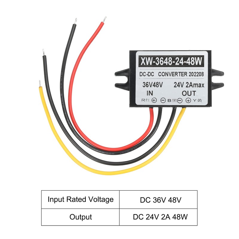 - Input Rated Voltage: DC 36V 48V; Output: DC 24V 2A 48W; Size: 46mm x 32mm x 18mm/1.81" x 1.26" x 0.71" (L*W*H); Mounting Hole Diameter: 4mm/0.16"; Mounting Hole Distance: 2.2"; Wire Length: 13.5cm.