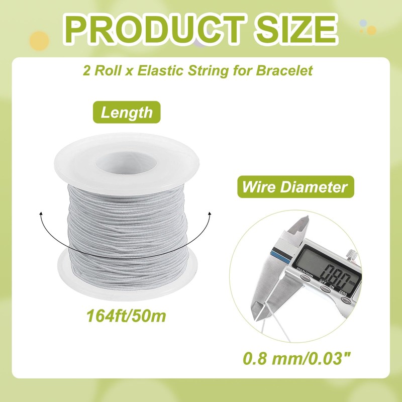 - Color: Gray; Material: Polyethylene, Rubber; Length: 164 ft/50 m; Wire Diameter: 0.8 mm/0.03 Inch; Package Content: 2 Roll x Elastic String for Bracelet