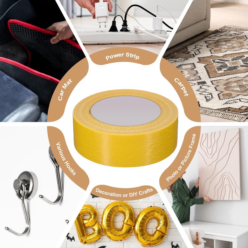 - Application: Double-sided fabric tape can be firmly adhered to various surfaces, suitable for carpets, sofa mats, door mats, car mats, posters, etc.mounting tape is suitable for hardwood, tile, glass, plastic, metal, ceramic, concrete and other surfaces. Such as curtains, refrigerators, photo frame hooks, DIY crafts, posters, photos, table mats, handmade and party decorations, home accessories, etc. It can also adjust women's clothing and firmly fix clothes.
