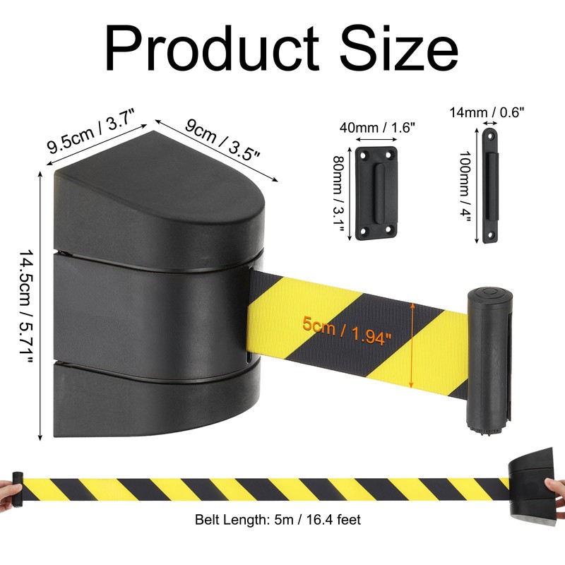 - Specification: Shell Color: Black; Band Color: Black Yellow; Shell Material: Plastic; Belt Material: Webbing; Size: 14.5 x 9.5 x 9cm/5.7 x 3.7 x 3.5inch(L*W); Belt Size: 500 x 5cm/16.4 x 0.16ft; Packing List: 1 x Wall Mount Retractable Belt, (Each Set include 4 screws and 4 rubber pads)