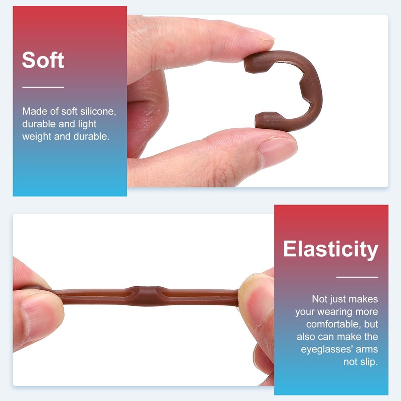 - Advantage: 1. Anti-slip design, not just makes your wearing more comfortable, but also can make the eyeglasses' arms not slip. 2. Made of soft silicone, durable and light weight and durable. 3. Both ends have holes, making your installation easier.