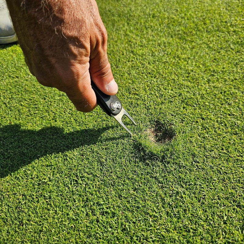 NOTE: Avoid excessive force when repairing turf ball marks to prevent further damage to the turf or roots beneath the surface.