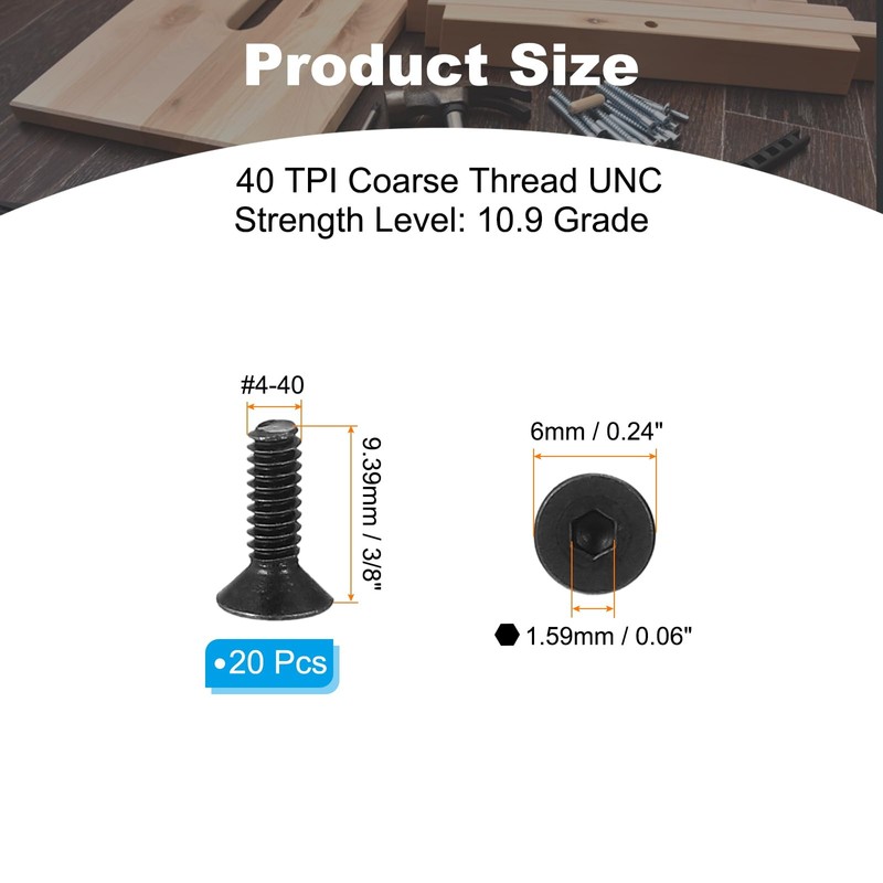 - Thread Count: 40 TPI Coarse Thread UNC; Thread Diameter: #4-40; Length: 3/8"(9.39 mm); Head Thickness: 2 mm / 0.08 inch; Packing List: 20 pcs x Flat Head Socket Cap Bolts