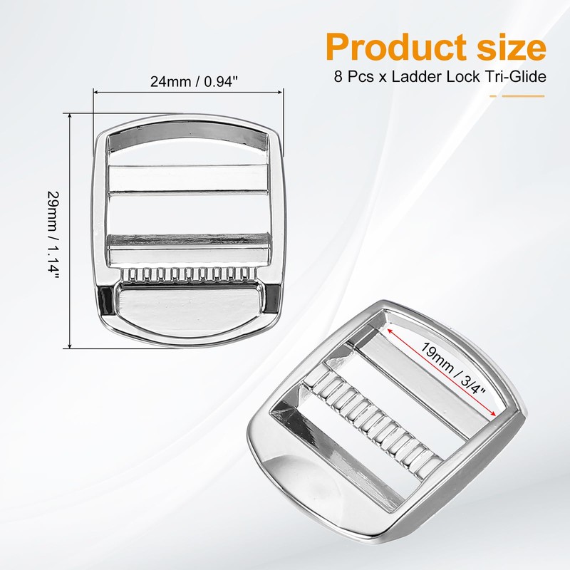 - Color: Silver; Material: Zinc Alloy; Inner Length: 19 mm / 3/4 inch; Overall Size: 29x24mm / 1.14x0.94 inch(LxW); Packing List: 8 Pcs x Ladder Lock Tri-Glide