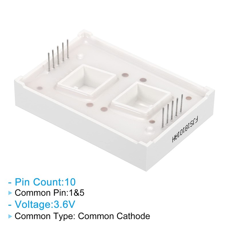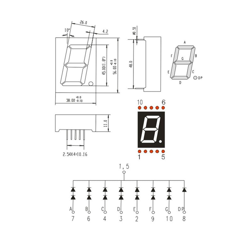 • Light Color: Red; Model: FJS18101AH; Package Type: Plug-in; Common Pin: 1&5; Voltage: 3.6 V; Pin Count: 10; Number of Characters: 1 Bit; Common Type: Common Cathode; Character Height: 1.5 inch; Size: 38 x 56 x 11 mm / 1.5 x 2.2 x 0.4 inch (L*W*H)