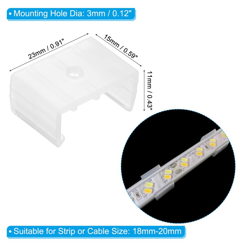 - Color: Translucent ; Material: Plastic; Total Size: 23mmx15mmx11mm / 0.91"x0.59"x0.43"; Inner Width: 16mm / 0.63"; Suitable for Strip or Cable Size: 18mm-20mm; Mounting Hole Dia.: 3.5mm / 0.14"; Screws Size: M3*12mm; Packing List: 100 Pack x LED Strip Light Clips, 100 Pack x Screws