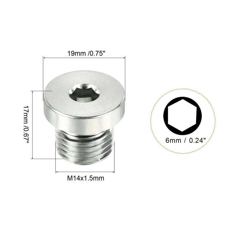 - Specification: Color: Silver Tone; Material: 45# Steel, Zinc Plated; Thread Size: M14*1.5mm; Internal Hex Width: 6mm / 0.24 inch; Overall Height: 19 x 17mm / 0.75 x 0.67 inch (D*H)