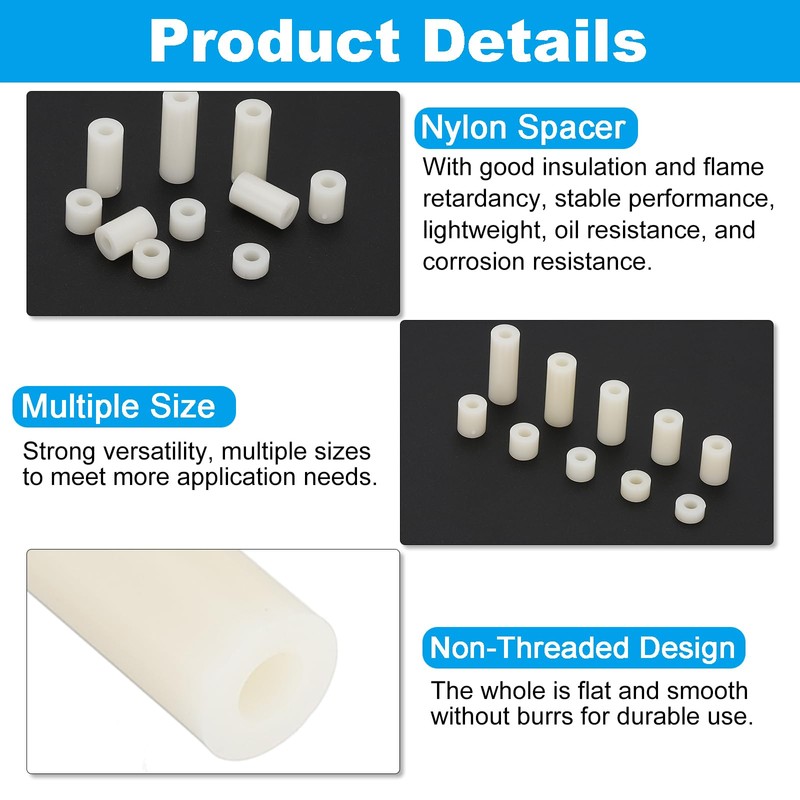 - Advantage: Made of nylon material, nylon spacers with good insulation and flame retardancy, stable performance, lightweight, oil resistance, and corrosion resistance. Strong versatility, multiple sizes to meet more application needs. Non-threaded design, the whole is flat and smooth without burrs for durable use. Easy to store and identify, nylon spacers packed in a storage box with size labels, easy to identify accessories of different sizes.