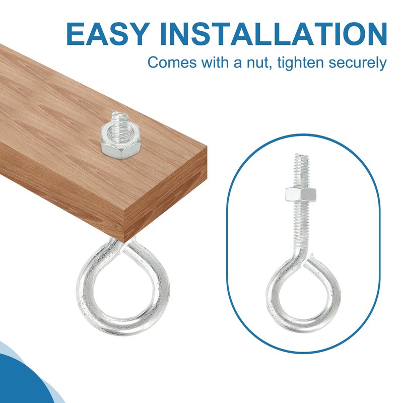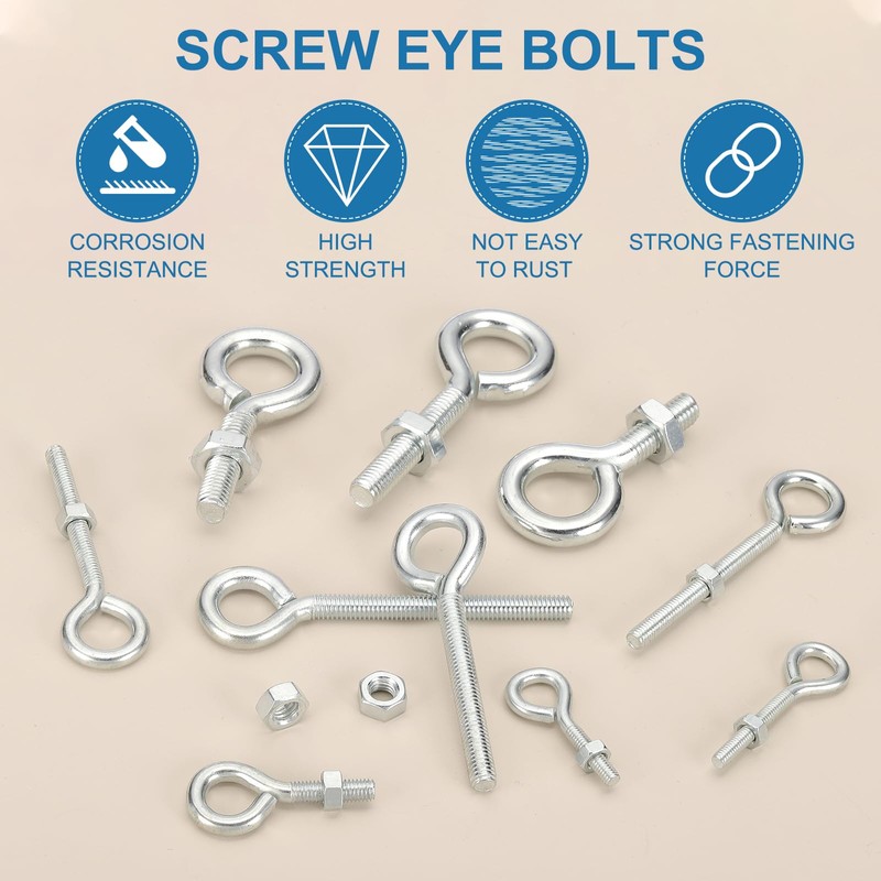 - Advantage: The eye bolts are made of carbon steel, which is wear-resistant, rust-resistant, and corrosion-resistant, suitable for indoor and outdoor use. The eye bolts are ring-shaped and can be used to secure ropes, cables, or chains. The threaded rod can be easily installed into pre-drilled holes or threaded surfaces