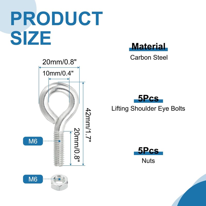 - Material: Carbon Steel; Thread Size: M6; Screw Length: 20 mm / 0.8 inch; Total Length: 42 mm / 1.7 inch; Ring Diameter: 10 x 20 mm / 0.4 x 0.8 inch (ID*OD); Packing List: 5 Pcs x Lifting Shoulder Eye Bolts, 5 Pcs x Nuts