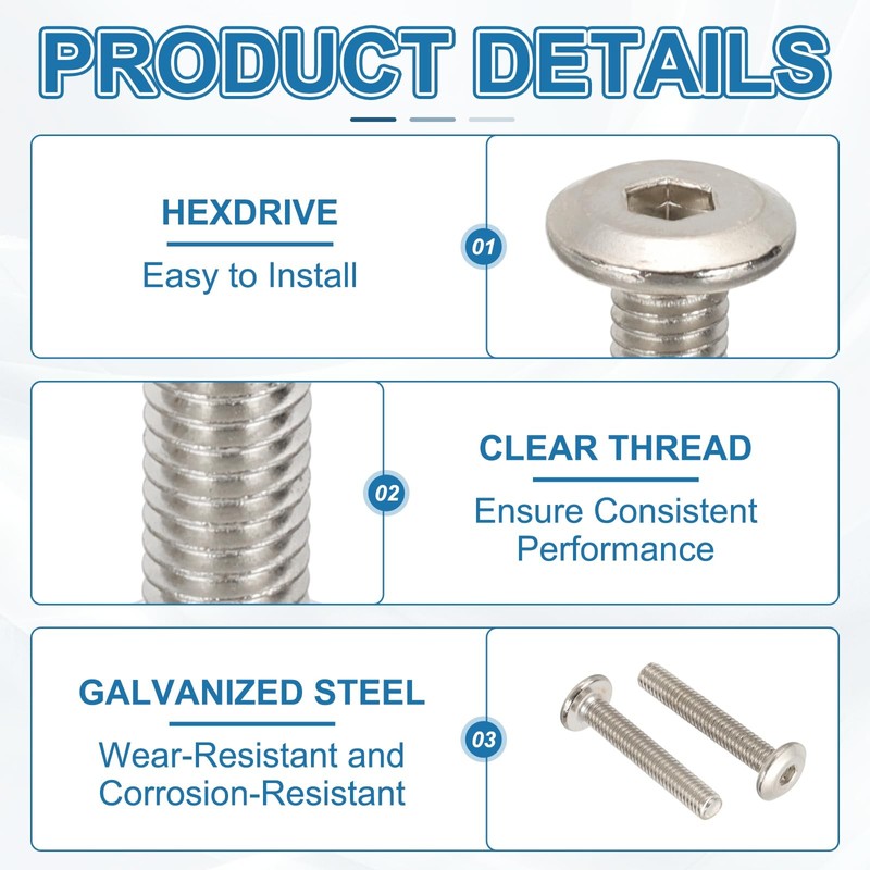 - Application: Hexagon socket bolts are used to fasten and fix components in various assemblies and structures, providing a firm and reliable connection. Widely used in furniture such as cabinets, workbenches, beds, tables, chairs, countertops, wood boards, and can also be used in leather crafts and DIY projects such as scrapbooks, bag decorations, boots, and purses