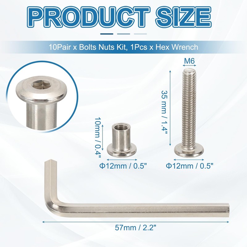 - Thread Specification: M6 x 35 mm; Hexagon Width: 4 mm / 0.16 inch; Head Width: 12 mm / 0.5 inch; Thread Pitch: 1 mm / 0.04 inch; Socket Length: 10 mm / 0.4 inch; Material: Carbon Steel; Packing List: 10Pair x Bolts Nuts Kit, 1Pcs x Hex Wrench