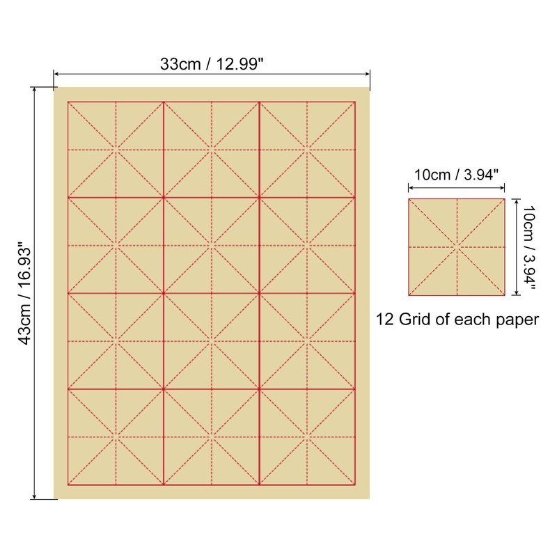 - Specification: Color: Light Yellow Size: 33 x 43 cm/ 12.99 x 16.93 inch (L*W) Grid Size: 10cm/3.94 inch(12 Grid of each paper) Packing List: 70 Sheets x Rice Paper(Half Raw Ripe Xuan)